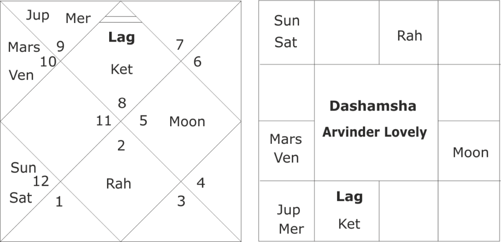 In year 2024 Arvinder Singh Lovely would be under favorable Rahu-Jupiter dasha in Vimshottari (July 2023 to December 2025). Jupiter is giving aspect to the 10th house where Rahu is placed. In Navamsha Jupiter is exalted and in Dashamsha it is in own sign. In both the charts Jupiter aspects the 10th house of career. So in 2024 Arvinder Singh Lovely can win Lok Sabha election seat to become a minister at center. Till 2024 both Ajay Maken and Arvinder Singh Lovely will not be able to do much to revive Congress Party in Delhi State.