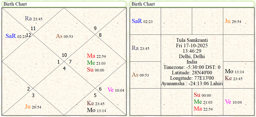 In mundane astrology, the Solar ingress chart (Surya Samkranti Kundali) cast at the time when the Sun enters movable signs like Aries, Cancer, Libra, and Capricorn holds greater significance than other Solar Ingress charts. However, predictions are made in mundane astrology by combining the Solar Ingress horoscopes with the foundation horoscope of the nation for which the prediction is to be made. This year, the Sun will enter Libra on October 17th at 1:37 pm Indian time. At the time of the Sun’s entry, Capricorn ascendant will be rising, which, being the ninth house of the Taurus ascendant chart of the independent India’s foundation horoscope (August 15, 1947, midnight, Delhi), is an astrological indication of some major decisions from the Supreme Court and other high courts in the next 30 days.